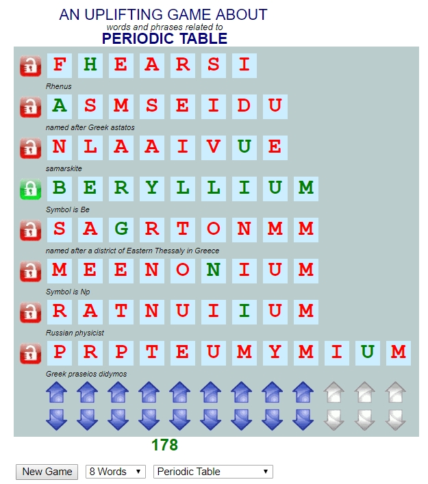 Uplifted is a free online word game with myriad themes, including the Periodic Table. Challenge your knowledge of the periodic table. Play for points and a chance to win a monthly prize from Brainy Games!